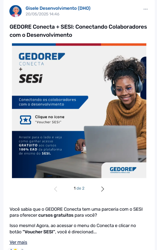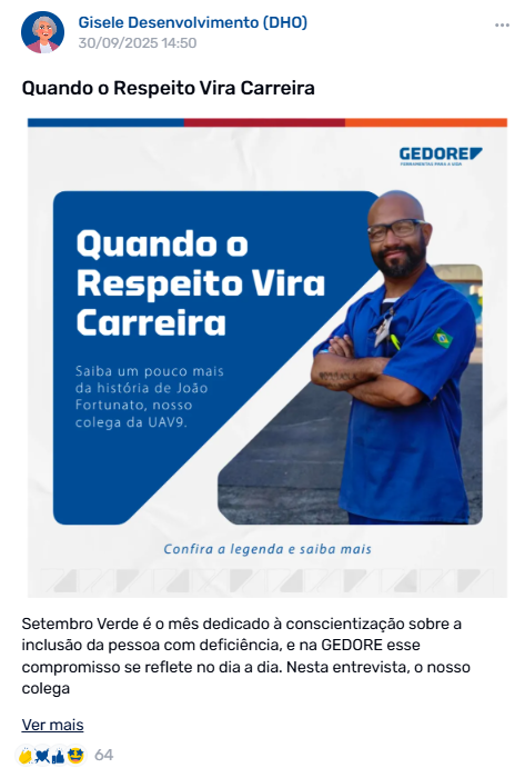 “Desde a implantação do GEDORE Conecta, houve uma evolução significativa na forma como a empresa se comunica com as pessoas, ampliando o alcance e fortalecendo a circulação das informações no dia a dia. Mesmo quando um colaborador não acessa diretamente o aplicativo, o conteúdo se propaga de forma natural entre as equipes, promovendo compartilhamento, conversa e maior alinhamento coletivo.”