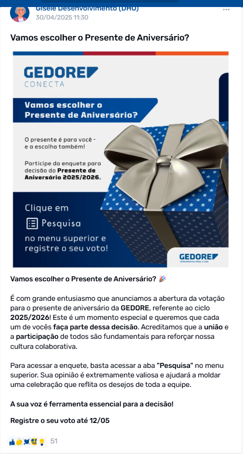 Usando o recurso “Pesquisa”, a GEDORE promoveu uma votação para que os colaboradores escolhessem o presente de aniversário, um dos benefícios oferecidos pela empresa.