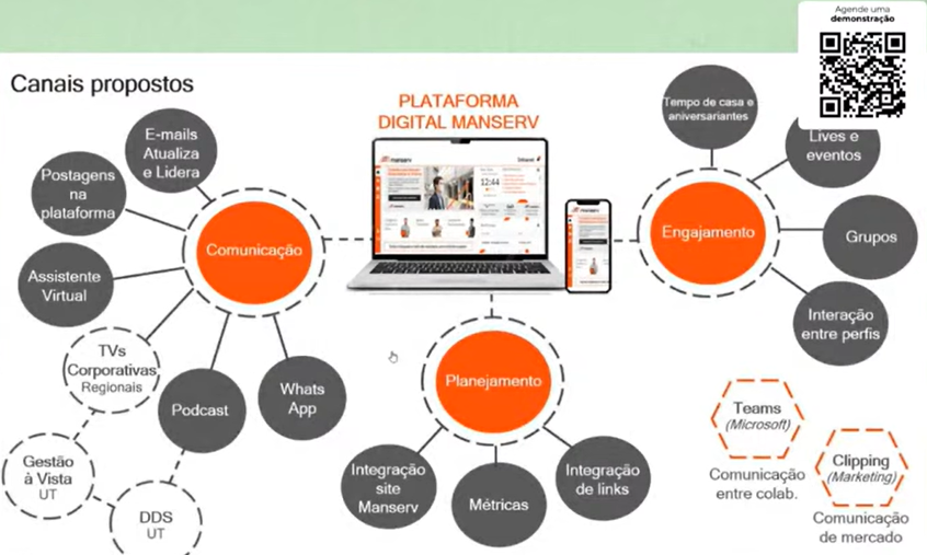 Antes do Manserv Comunica, os canais de CI usados eram: jornal eletrônico (newsletter), e-mail e intranet. Além disso, o DDS (Diálogo Diário de Segurança), Teams, clipping, lives e até o uso informal do WhatsApp eram outros pontos de comunicação (não necessariamente tocados por CI).