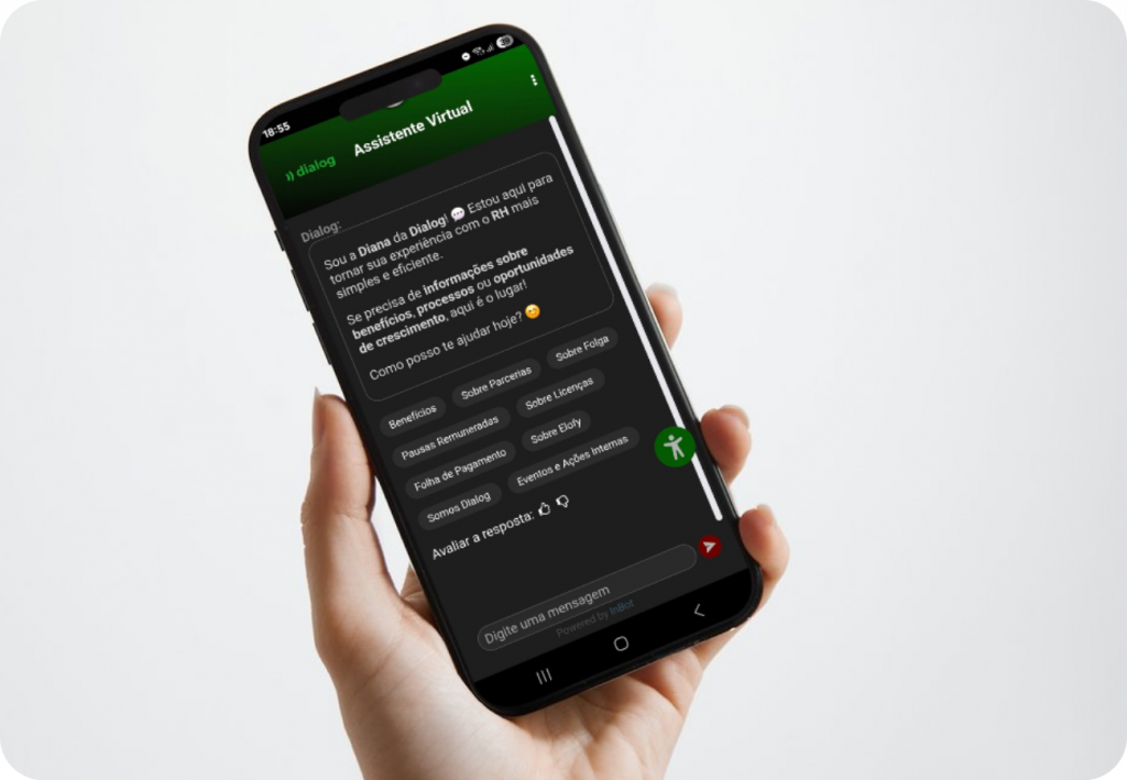 Integrado ao seu canal de comunicação, esse assistente virtual oferece respostas instantâneas para dúvidas rotineiras, garantindo que o colaborador tenha a informação que precisa na hora, sem esperar o retorno de um profissional responsável pelo setor.